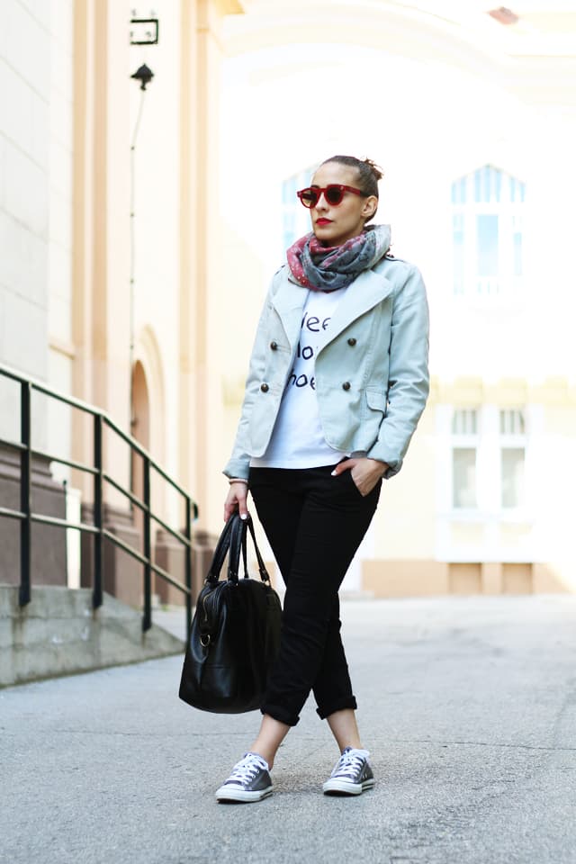Jakna (jacket) NEW YORKER, majica (t-shirt) HICustom, pantalone (pants) TOM TAILOR, patike (sneakers) CONVERSE, tašna (purse) H&M, naočari (sunglasses) PAPP UV, marama (scarf) poklon (gift). Ph. Gordana