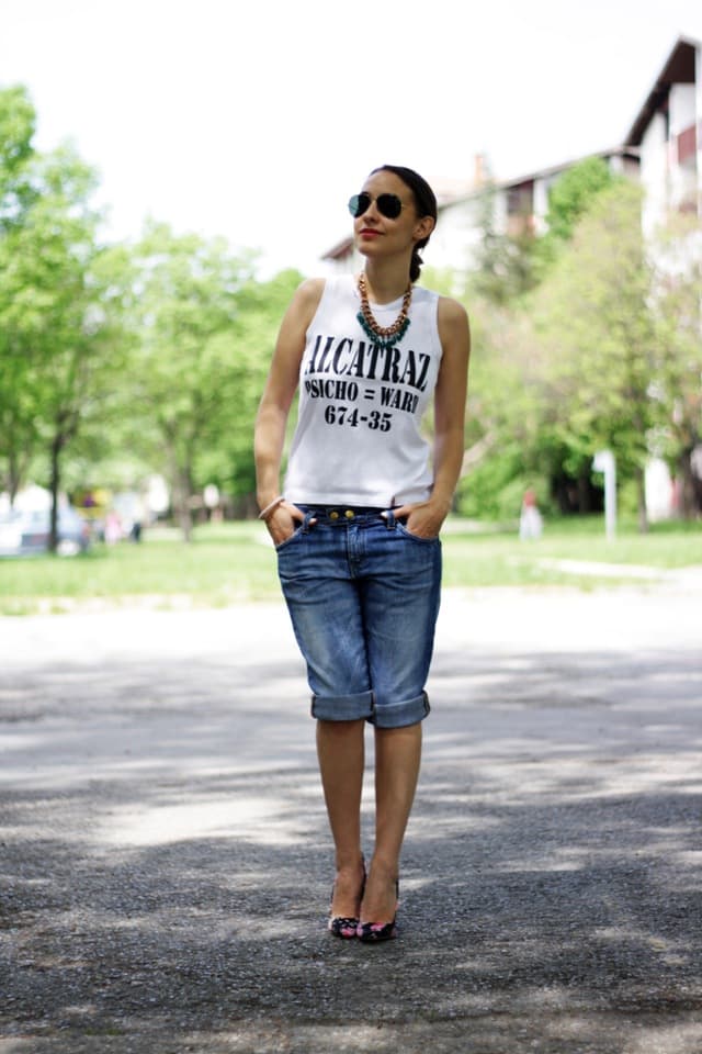 Muška majica (top) iz Barselone, bermude (shorts) H&M, cipele (shoes) ASOS, ogrlica (necklace) Milica Trninić, naočari (sunglasses) RAY-BAN.