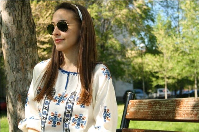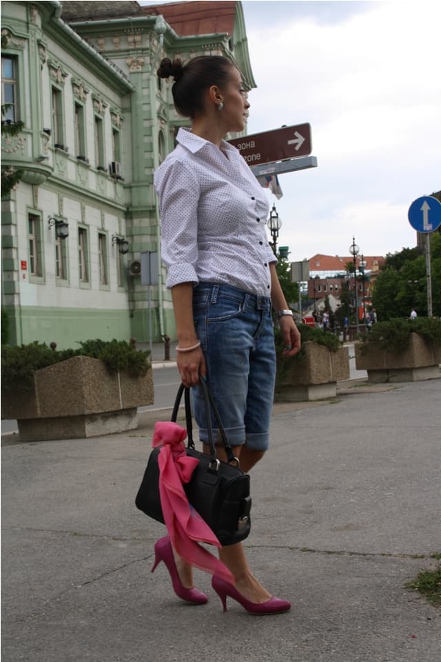 Košulja (shirt) i šorts (shorts) H&M, cipele (shoes) i sat (watch) DKNY, tašna (handbag) MONA, marama (scarf) i minđuše (earrings) stare (vintage).