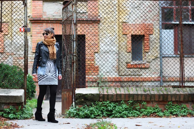 Jakna (jacket): Mango, košulja (shirt): H&M, haljina (dress): Pinkbasis, čizme (boots): Zara, marama (scarf): Tie rack, naočari (sunglasses): Ray-Ban. Ph. Katarina Buha